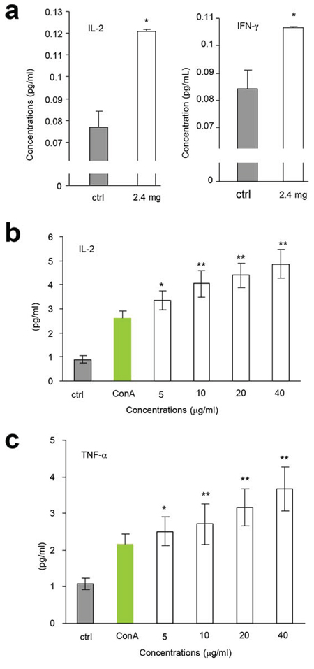 We tested the immunoreactivity of the partially purified polysaccharides in vivo. After tumor cell implantation, the mice were orally given the polysaccharide fraction with the highest activity in lymphocyte proliferation (Fraction F0.5, 2.4 mg/mouse). 7 h after delivery, we detected significant increase in the secretion of IL-2 (Figure 4a, left) and IFN-γ (Figure 4a, right) compared with the control. These results were further confirmed by in vitro assays, where the partially purified F0.5 Fraction was applied to mouse spleen lymphocytes. 24 h after the addition of the polysaccharides, we detected significant increase in the secretion of IL-2 (Figure 4b) and TNF-α (Figure 4c) in a dose-dependent manner, compared to the control.