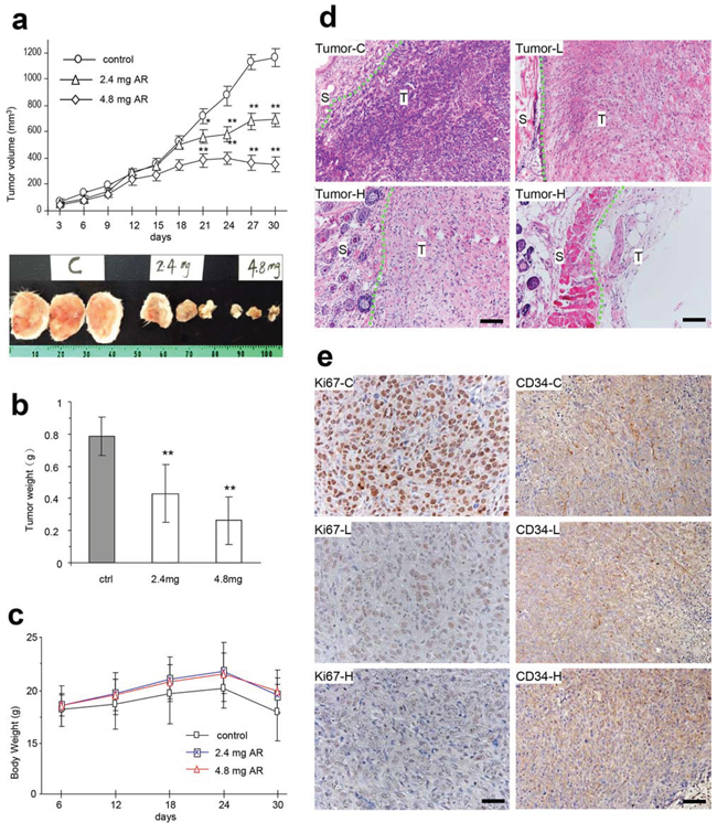 Tumor sections were subject to H&E staining and examined under a light microscope. We found that the AR extract induced extensive tumor cell death (Figure 5d). We also examined the proliferative capacity of the tumor cells using Ki67 positive cells. Injection of AR extract in the tumor implanted mice significantly decreased Ki67 positive cells, which suggested decreased proliferative activity (Figure 5e). Furthermore, CD34 staining also displayed decreased levels of positive cells in these mice (Figure 5e).