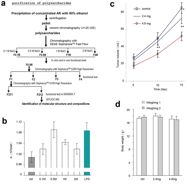 Figure 6: Partial purification of the polysaccharides and their effects on lymphocyte activity and tumor growth. a. Procedure for purification of polysaccharides from the water extract of Amauroderma rude. b. The effect of four different components purified from AR extract on the proliferation of mouse spleen lymphocytes. It appeared that the fraction eluted with 0.5 M (F0.5) NaCl displayed the strongest effect on increasing lymphocyte proliferation. c. After tumor cell implantation, the mice were injected with the partially purified polysaccharides F0.5 at different time points as indicated in the Methods section, and monitored for tumor growth. Injection with F0.5 inhibited tumor growth in both doses used. Asterisks indicate significant differences. *p < 0.05, **p < 0.01. Error bars, SD (n = 12 mice). d. The body weight of the mice was not affected by tumor cell implantation or by polysaccharide injection.
