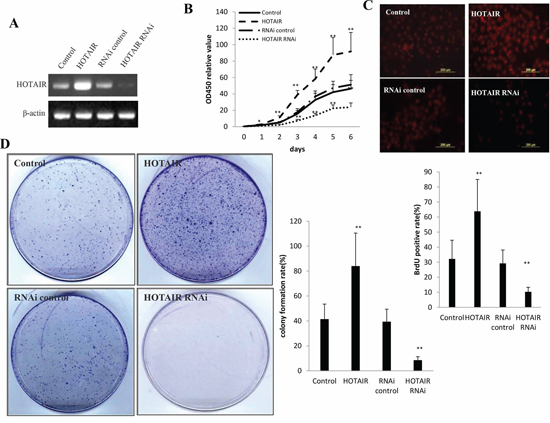 Figure 2: HOTAIR accelerlates human liver cancer stem cells (hLCSC) growth in vitro. A. The RT-PCR analysis of HOTAIR in stable hLCSC cell lines transfected pCMV6-A-GFP, pCMV6-A-GFP-HOTAIR, pGFP-V-RS, pGFP-V-RS-HOTAIR.β-actin as internal control. B. Cells growth assay using CCK8. Each value was presented as mean ± standard error of the mean (SEM). C. S phase cells assay using BrdU. Each value was presented as mean ± standard error of the mean (SEM). D. Cells colony formation assay. Each value was presented as mean ± standard error of the mean (SEM).