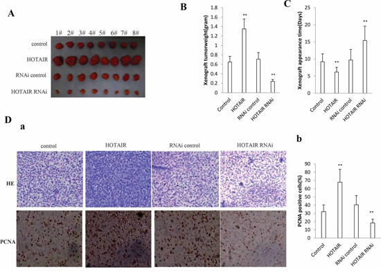 Figure 3: HOTAIR promotes human liver cancer stem cells (hLCSCs) growth in vivo. A. The mice were stratified and the tumors were recovered. The photography of xenograft tumor in the four groups (indicated in left). B. The wet weight of each tumor was determined for each mouse. Each value was presented as mean ± standard error of the mean (SEM). C. The Xenograft appearance time (days). Each value was presented as mean ± standard error of the mean (SEM). D. a. A portion of each tumor was fixed in 4% paraformaldehyde and embedded in paraffin for histological hematoxylin-eosin (HE) staining (upper) and anti-PCNA immunostainning (lower). (original magnification × 100). b. PCNA positive cells analysis. Each value was presented as mean ± standard error of the mean (SEM).