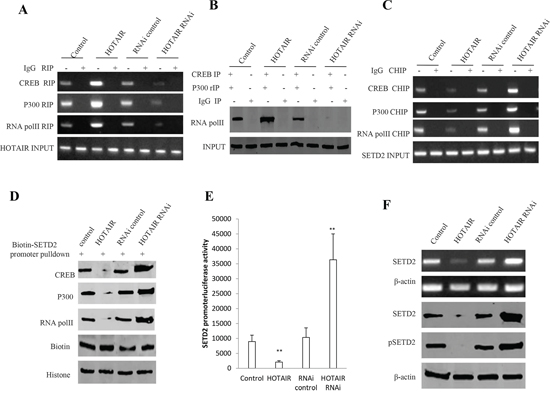 Figure 4: HOTAIR inhibits SETD2 expression in human liver cancer stem cell (hLCSC). A. RNA Immunoprecipitation (RIP) with anti-CREB, anti-P300 and anti-RNApolII followed by RT-PCR with HOTAIR primers in HOTAIR overexpression or knockdown human liver cancer stem cells (hLCSC). IgG RIP as negative control. HOTAIR as INPUT. B. anti-CREB Co-Immunoprecipitation (IP) and anti-P300 repeated Co-Immunoprecipitation (rIP) followed by Western blotting with anti-RNA polII. IgG IP as negative control. INPUT refers to Western blotting with anti-RNA polII. B. HOTAIR inhibits SETD2 expression in human liver cancer stem cell (hLCSC). C. Western blotting with anti-H3K36me1, anti-H3K36me2, anti-H3K36me1. β-actin as internal control. C. Chromatin Immunoprecipitation (CHIP) with anti-CREB, anti-P300 and anti-RNApolII followed by PCR with SETD2 promoter primers in HOTAIR overexpression or knockdown hLCSC cell line. IgG CHIP as negative control. SETD2 promoter DNA as INPUT. D. Biotin-SETD2 promoter probe pulldown followed by Western blotting anti-CREB, anti-P300 and anti-RNApolII primers in HOTAIR overexpression or knockdown human liver cancer stem cell (hLCSC). Biotin as INPUT and Histone as internal control. E. SETD2 promoter luciferase activity assay in HOTAIR overexpression or knockdown human liver cancer stem cell (hLCSC). Each value was presented as mean ± standard error of the mean (SEM). F. SETD2 expression analysis by RT-PCR with SETD2 cDNA primers and Western blotting with anti-SETD2 and anti-pSETD2. β-actin as internal control.