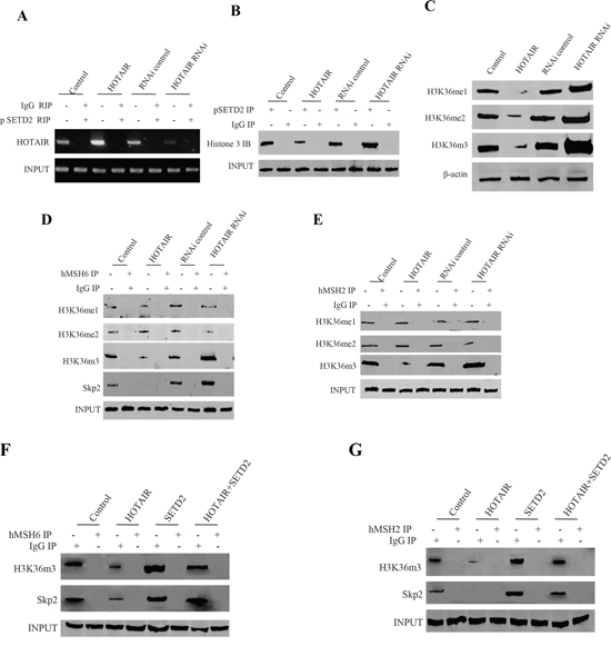 Figure 5: The HOTAIR inhibits the interaction among hMSH6, H3k36me3 and Skp2 in stable human liver cancer stem cell (hLCSC) transfected with pCMV6-A-GFP, pCMV6-A-GFP-HOTAIR, pGFP-V-RS, pGFP-V-RS-HOTAIR. A. RNA Immunoprecipitation (RIP) with anti-pSETD2 followed by RT-PCR with HOTAIR primers in HOTAIR overexpression or knockdown human liver cancer stem cells (hLCSC). IgG RIP as negative control. HOTAIR as INPUT. B. anti-SETD2 Co-Immunoprecipitation (IP) followed by Western blotting with anti-Histone3. IgG IP as negative control. INPUT refers to Western blotting with anti-SETD2. C. Western blotting with anti-H3K36me1, anti-H3K36me2, anti-H3K36me1. β-actin as internalcontrol. D. Anti-hMSH6 Co-Immunoprecipitation (IP) followed by Western blotting with anti-H3K36me3, anti-H3K36me2, anti-H3K36me1 anti-SKP2. IgG IP as negative control. INPUT refers to Western blotting with anti-hMSH6. E. Anti-hMSH2 Co-Immunoprecipitation (IP) followed by Western blotting with anti-H3K36me3, anti-H3K36me2, anti-H3K36me1. IgG IP as negative control. INPUT refers to Western blotting with anti-hMSH2. F. Anti-hMSH6 Co-Immunoprecipitation (IP) followed by Western blotting with anti-H3K36me3, anti-SKP2. IgG IP as negative control. INPUT refers to Western blotting with anti-hMSH6. G. Anti-hMSH2 Co-Immunoprecipitation (IP) followed by Western blotting with anti-H3K36me3, anti-SKP2. IgG IP as negative control. INPUT refers to Western blotting with anti-hMSH2.