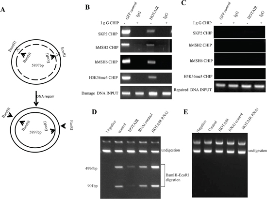 Figure 6: The HOTAIR inhibits the hMSH2/6-H3k36me3-Skp2 ternary complex loading onto the injury DNA in human liver cancer stem cell (hLCSC). A. The schematic illustrates a model that injury plasmids (EcoRI mismatch) was repaired after the plasmid was transfected and intergrated into chromosome. B. Chromatin Immunoprecipitation (CHIP) with anti-SKP2, anti-hMSH2, anti-hMSH6, anti-H3K36me3 followed by PCR with damaged DNA primers. IgG CHIP as negative control. damaged DNA as INPUT. C. Chromatin Immunoprecipitation (CHIP) with anti-SKP2, anti-hMSH6, anti-hMSH6, anti-H3K36me3 followed by PCR with match double DNA primers. IgG CHIP as negative control. match double DNA DNA as INPUT. D. Restriction endonuclease analysis with BamHI and EcoRI for DNA injury repair. E. Restriction endonuclease analysis with BamHI and EcoRI for DNA injury imrepair.