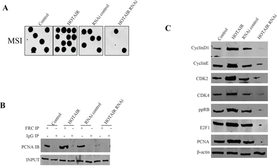 It is a fact that cells lacking the H3K36 trimethyltransferase SETD2 display microsatellite instability (MSI) which may alter cell cycle protein expression. We performed a microsatellite instability (MSI) assay through Dot blot (Slot blot) using various Biotin labling MSI probes (Biotin-MSIs) in hLCSCs cells transfected with pCMV6-A-GFP, pCMV6-A-GFP-HOTAIR, pGFP-V-RS, pGFP-V-RS-HOTAIR. As shown in Figure 7A, HOTAIR overexpression increased the MSI compared to control, while HOTAIR knockdown reduced the MSI compared to control. Co-IP results showed that HOTAIR overexpression increased the interaction between RFC and PCNA compared to control, while HOTAIR knockdown reduced interaction between RFC and PCNA compared to control (Figure 7B). Western blotting results showed that the overexpression of HOTAIR increased the expression of CyclinE, CyclinD1, CDK2, CDK4, ppRB, E2F1, PCNA, while the knockdown of HOTAIR reduced the expression of CyclinE, CyclinD1, CDK2, CDK4, ppRB, E2F1, PCNAs (Figure 7C). Taken together, these results suggest HOTAIR causes microsatellite instability (MSI) and abnormral expression of cell cycle related gene, e.g. CDK2, CyclinE, CDK4, CyclinD1, PCNA, ppRB, E2F1.