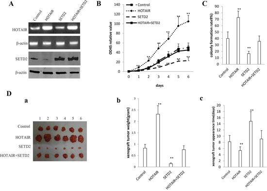 Figure 8: The rescued experiment of carcinogenesis effect of the HOTAIR. SETD2 overexpression abrogated the HOTAIR oncogenic function in stable human liver cancer stem cell (hLCSC) transfected with pCMV6-A-GFP, pCMV6-A-GFP-HOTAIR, pcDNA3.1-SETD2, pCMV6-A-GFP-HOTAIR plus pcDNA3.1-SETD2. A. The RT-PCR analysis of HOTAIR (upper) and the western blotting analysis with anti-SETD2 (lower). β-actin as internal control. B. Cells growth assay using CCK8. Each value was presented as mean ± standard error of the mean (SEM). C. Cells colony-formation efficiency assay. Each value was presented as mean ± standard error of the mean (SEM). D. In vivo test in human liver cancer stem cells (hLCSC) transfected with pCMV6-A-GFP, pCMV6-A-GFP-HOTAIR, pcDNA3.1-SETD2, pCMV6-A-GFP-HOTAIR plus pcDNA3.1-SETD2. a. The mice were stratified and the tumors were recovered. The photography of xenograft tumor in the three groups (indicated in left). b. The wet weight of each tumor was determined for each mouse. Each value was presented as mean ± standard error of the mean (SEM). c. The xenograft appearance time (day). Each value was presented as mean ± standard error of the mean (SEM).