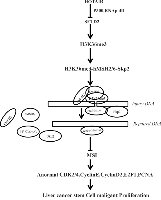 Figure 9: The schematic illustrates a model that HOTAIR promotes human liver cancer stem cell (hLCSC) malignant transformation through downregulation of SETD2. Oncogenic HOTAIR reduces the recuritment of the CREB, P300, RNApolII onto the SETD2 promoter region that inhibits SETD2 expression and its phosphorylation. The reduced SETD2 binding capacity of substrate histone, triggering a reduction of tri-methylation on histone 3 thirty-sixth lysine, and thereby the H3K36me3–hMSH2-hMSH6-SKP2 four complex is reduced. And the four complex occupancy on chromosome is reduced, preventing from damage DNA repair. While reducing the degradation ability, of SKP2 for old histone H3 bound to damaged DNA, the aging Histone repair is delayed. That the damaged DNA escaped to repair can lead to microsatellite instability (MSI) and abnormal expression of cell cycle related genes that promotes hepatocarcinogenesis.