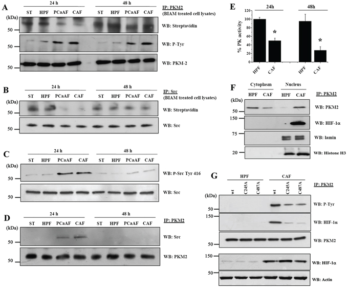 Figure 1: CAFs conditioning promotes PKM2 oxidation and tyrosine phosphorylation, leading to its nuclear localization and association with HIF-1α. PC3 cells were cultured in serum-free medium (ST) or with CM from HPFs, PCaAFs (in vitro activated HPFs by PC3-CM) or patient-derived CAFs for 24 h or 48 h. A. PC3 cell were lysed in presence of BIAM and PKM2 was immunoprecipitated (IP). Western blot (WB) with HRP-streptavidin and with anti P-Tyr antibody were performed to evaluate the reduced form of PKM2 and its tyrosine phosphorylation, respectively. Anti-PKM2 antibody was used for normalization. B. Src kinase IP from BIAM-labeled lysates were subject to anti HRP-streptavidin (to reveal the reduced form of Src) and to anti-Src for normalization. C. Total cell lysates were subject to WB using the anti Src-Tyr 416 or anti Src antibodies. D. PKM2/Src association was revealed by WB analysis on PKM2 IP using an anti-Src antibody. PKM2 immunoblot was used for normalization. E. The analysis of PK activity was performed on PC3 cells after 24 h or 48 h of treatment with CM from HPFs or CAFs. *p < 0.005 vs HPF. F. Nuclear and cytosolic fractions derived from HPFs CM or CAFs CM 48 h treated PC3 cells were subject to PKM2 IP. Anti-HIF-1α and anti-PKM2 immunoblots were used to evaluate a direct association of the two proteins and for normalization, respectively. Lamin and histone H3 immunoblot were used as a control for nuclear extraction. G. The redox insensitive Src mutants (C245A and C487A) and Src wt plasmids were transfected into PC3 cells and after 24 h cells were incubated for additional 48 h with HPFs CM or CAFs CM. Total cell lysates were subject to PKM2 IP and WB analysis performed using the listed antibodies.