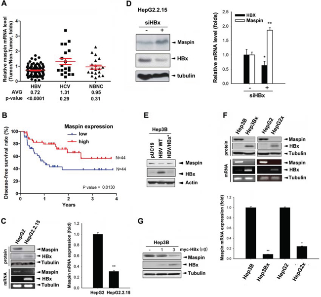 Figure 1: HBx-mediated maspin suppression correlated with poor prognosis of HBV-associated HCC patients. A. Total RNA extracted from tumor and adjacent normal tissues of HBV-, HCV-, or NBNC-associated HCC patients were analyzed by real-time qPCR with maspin and GAPDH primers. The difference in maspin expression between tumor and normal tissue was presented as relative expression ratio with the normalization to GAPDH and calculated by a paired Student’s t-test. B. Disease-free survival according to maspin mRNA expression level in HBV-associated HCC tissues was determined by Kaplan–Meier analysis (n = 88). C–G. Maspin protein and mRNA expression in HBV genome-(C-E) or HBx-transfected (F and G) HepG2 and Hep3B cells in the presence of HBx siRNA (n = 3) (D) were analyzed by Western blot, PCR, and RT-qPCR analyses. The difference was calculated by a Student’s t-test (*p < 0.05; **p < 0.01)