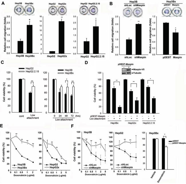 Figure 2: Maspin suppression confers to HBx-induced migration, anoikis resistance, and chemoresistance in HCC cells. A and B. The migratory capabilities of Hep3B, Hep3Bx, HepG2, HepG2x, HepG2.2.15, and maspin-modulated cells were measured by transwell migration assay (n = 3). C and D. HepG2, HepG2.2.15, Hep3B, Hep3Bx, and maspin-expressing Hep3Bx, HepG2, and HepG2.2.15 cells were cultured on Ultra-low attachment plates followed by cell number counting assays (n > 4). E and F. Hep3B, Hep3Bx, HepG2, HepG2x, maspin-modulated Hep3B, HepG2 cells, and Hep3Bx cells were treated with indicated concentrations or 1 μg/ml of doxorubicin for 24 hours and then were subjected to MTT assay (n > 3). The difference was calculated by a Student’s t-test (*p < 0.05; **p < 0.01)