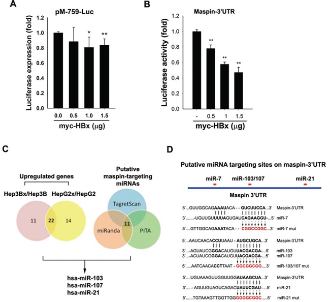 Figure 3: Effects of HBx on maspin promoter activity, 3′UTR activity, and maspin-targeting microRNAs induction. A and B. HEK-293 cells co-transfected with maspin promoter-luciferase gene (A) or maspin 3′UTR-luciferase gene (B) and myc-tagged HBx for 24 hours were subjected to luciferase activity assays (n = 5 and n = 3, respectively). C. Total RNA extracted from Hep3B, Hep3Bx, HepG2, and HepG2x cells were subjected to microRNAs microarray analysis to examine the effect of HBx on the induction of microRNA expression. The putative maspin-targeted microRNAs were further analyzed by using three prediction programs. D. The diagram illustrates the predicted target sites of microRNAs-7, -21, and, -103/107 on maspin 3′UTR and their mutations on the maspin 3′UTR-luciferase construct. The difference was calculated by a Student’s t-test (*p < 0.05; **p < 0.01)