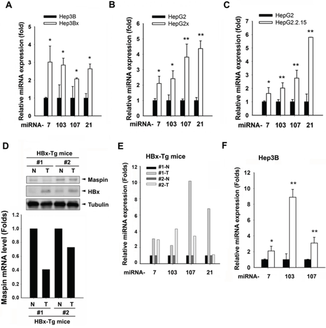 Figure 4: Effects of HBx on the expression of maspin mRNA, protein, and maspin-targeted miRNAs in HCC cell lines and HBx-transgenic mice. A–C. Total RNA extracted from Hep3B, Hep3Bx, HepG2, HepG2x, and HepG2, and HepG2.2.15 cells were subjected to RT-qPCR analysis with specific primers to examine the expressions of indicated microRNAs (n > 4). D–E. Total cell lysates and RNA extracted from tumor and adjacent normal tissues of HBx-transgenic mice were analyzed by western blot and RT-qPCR. Expression levels of maspin and HBx protein, maspin mRNA, and miRNAs levels were normalized to tubulin, GAPDH, and U6B, respectively. F. Total RNA extracted from HBx-transfected Hep3B cells were subjected to RT-qPCR to examine the effect of HBx on the induction of microRNA expression (n = 3). The difference was calculated by a Student’s t-test (*p < 0.05; **p < 0.01)