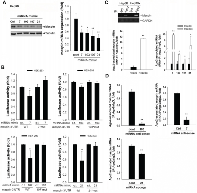 Figure 5: HBx-induced miRNAs suppressed maspin expression through directly interacting maspin 3′UTR. A. Hep3B cells transfected with indicated microRNA mimics were subjected to examine the protein and mRNA levels of maspin in Western blot and RT-qPCR analyses, respectively (n = 10). B. HEK-293 cells were cotransfected with indicated microRNA mimics and luciferase constructs containing maspin 3′UTR wild type or mutated sequences for 24 hours, and were then subjected to luciferase activity assays (n = 5). C. and D. Hep3B and Hep3Bx cells transfected with indicated miR-7 antisense, miR-103 antisense, or miR-21 sponge were subjected to RNA immunoprecipitation with anti-Ago-2 antibody. The RNA extracted from anti-Ago2 immunoprecipitates were analyzed with maspin or indicated microRNA primers (n > 3). The difference was calculated by a Student’s t-test (*p < 0.05; **p < 0.01).