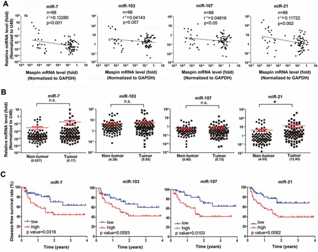 HCC tissue sections and specimens were purchased from Taiwan Liver Cancer Network, Zhunan, Taiwan and provided from National Cheng Kung University Hospital, Tainan, Taiwan. Informed consents were signed by patients with approval by the Institutional Review Board, China Medical University Hospital, Taichung, Taiwan (DMR101-IRB1-119) and by the Institutional Review Board of the Human Investigation Committee of College of Medicine, National Cheng Kung University Tainan, Taiwan (B-ER-102-210). The clinical sample information met REMARK (REporting recommendations for tumor MARKer prognostic studies) guideline was shown in the Supplemental Figure S7. One hundred and seven patients who had primary HCC underwent hepatectomy at National Cheng Kung University Hospital from January 2007 through December 2012, were included. Patients with a previous diagnosis of cancer, positive surgical margins and a diagnosis of combined hepatocellular-cholangiocarcinoma were excluded. Twelve patients were excluded due to a positive surgical margin and seven patients were excluded due to a diagnosis of combined hepatocellular-cholangiocarcinoma. The remaining eighty-eight patients were included for further study (Supplemental Figure S7 and Supplemental Table S3). The follow-up interval was every 3 months. Recurrence of HCC was documented upon typical findings of computed tomography or magnetic resonance imaging with or without raised serum AFP level or pathological confirmation. Disease-free survival (DFS) was defined as time from surgery to the first occurrence of either local or distant recurrence. Disease-specific survival (DSS) was defined as time from surgery to HCC-related death. Subjects were censored at the last follow-up appointment or at death without recurrence. The patient profiles of the 88 HCC patients were shown in Supplemental Table S3. The patients included 52 (59.1%) males and 36 (40.9%) females with age range of 42 to 78 years (mean age 59.7 years). The median follow-up time was 28 months (range, 3 to 46.5 months). At the end of the follow-up, thirty-eight patients (46.6%) had recurrent HCC (median duration until recurrence, 9 months; range, 2.5–38.6 months), including local recurrence in 28 patients, metastasis in 6 patients, and both local recurrence and metastasis in 4 patients. The 1-year disease specific survival rate was 91.4% and 3-year disease specific survival rate was 65.6%. Informed consent in writing was obtained from each patient and the study protocol conformed to the ethical guidelines of the 1975 Declaration of Helsinki as reflected in a priori approval by the Human Experiment and Ethics Committee of National Cheng Kung University Hospital in Tainan, Taiwan. The diagnosis of HBV and HCV-associated HCC subtype was made on the basis of presence of HBV or HCV surface antigen. The characteristics of these patients were described in Supplemental tables S3 and S4. Expressions of Maspin mRNA (Figure 1A) and microRNAs (Figure 6) normalized respectively to GAPDH and U48 were determined in RT-qPCR analysis. Their differences in various HCC tumor tissues compared to the normal tissues was determined in the paired two-tailed Student’s t-test and p < 0.05 was defined as statistically significant.