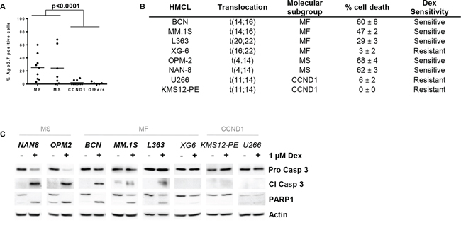 Figure 1: Dex sensitivity is heterogeneous and restricted to the MS and MF HMCL subgroups. A. HMCLs (n = 31) were treated with 1 μM Dex for 72 hours, and cell death was assessed by Apo2.7 staining. HMCLs were classified into 4 groups as follow: MS, MF, CCND1 and Others for no or no recurrent translocation cell lines. Of note, HMCLs harboring a t(14;20), t(20;22) or t(16;22) were included in the MF subgroup. Each symbol represents one HMCL. Statistical analysis was performed using the Mann Whitney test. B. Characteristics of selected sensitive and resistant cell lines. Dex sensitivity was defined as follows: sensitive, ≥ 15% apoptotic HMCL cells and resistant, < 15% apoptotic HMCL cells. C. Cell death signature was analyzed by immunoblotting after 24 hours of Dex treatment. Actin was used as a loading control.