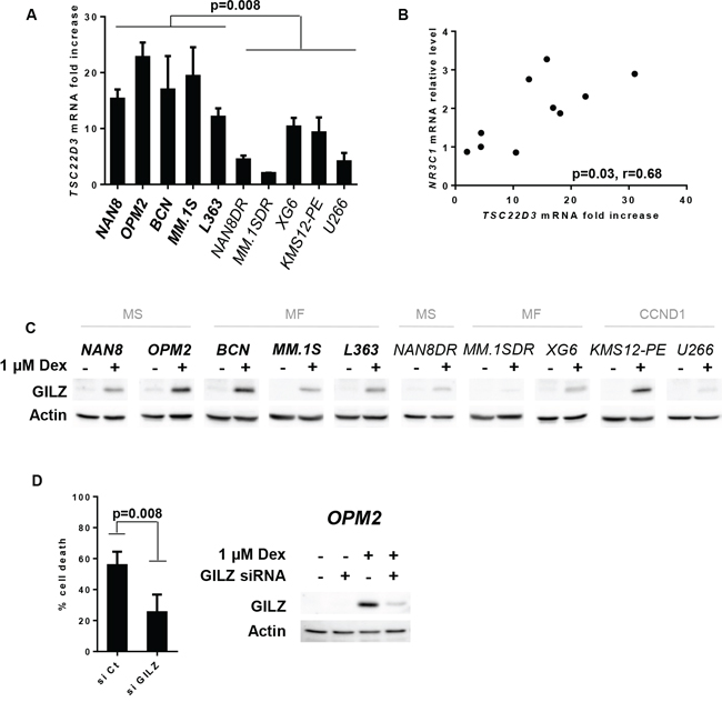 Figure 3: GILZ up-regulation is necessary for Dex-induced apoptosis. A. TSC22D3 mRNA expression was assessed by Q-PCR after 24 hours of Dex treatment. TSC22D3 mRNA induction was assessed by calculating the fold increase relative to the untreated cell line. The mean ± SD of 3 experiments is presented. Statistical analysis was performed using the Mann Whitney test. B. Analysis of the relative NR3C1 mRNA level versus the fold increase of TSC22D3 mRNA under Dex treatment. Spearman’s rank correlation coefficient is indicated. C. Cell lines were treated with Dex for 24 hours and cell lysates were immunoblotted with a GILZ antibody. D. Following GILZ silencing, OPM2 cells were treated with Dex. Cell death was assessed by Apo2.7 staining after 48 hours of Dex treatment. Data represent the mean ± SD of 4 independent experiments. Statistical analysis was performed using Wilcoxon matched-pairs signed rank test. After 16 hours of Dex treatment, GILZ silencing was analyzed by immunoblotting.