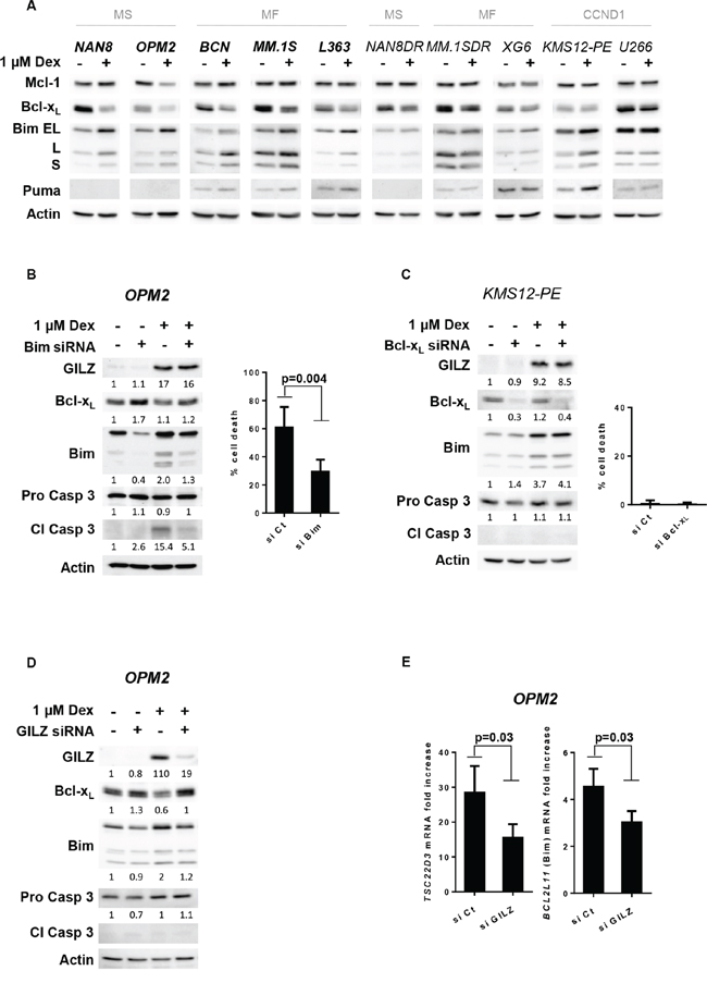 Figure 4: GILZ is involved in Bim up-regulation and Bcl-xL down-regulation associated with Dex-induced apoptosis. A. Cell lines were treated with Dex for 24 hours and lysates were immunoblotted with Mcl-1, Bcl-xL, Bim and Puma antibodies. B. Following siRNA transfection, OPM2 cells were treated with Dex for 48 hours. The expression of Bim, Bcl-xL, GILZ and caspase 3 were analyzed by immunoblotting and normalized (arbitrary unit) to actin expression. Apoptosis was quantified by Apo2.7 staining. The results show the mean ± SD of 4 independent experiments. Statistical analysis was performed using Wilcoxon matched-pairs signed rank test. C. Following siRNA transfection, KMS12-PE cells were treated with Dex for 48 hours. The protein expressions were analyzed by immunoblotting and normalized (arbitrary unit) using actin expression. Apoptosis was quantified by Apo2.7 staining. The results show the mean ± SD of 3 independent experiments. D. GILZ was transiently silenced in OPM2 cells for 48 hours, before to be treated with Dex for 16 hours. The protein expressions were analyzed by immunoblotting and normalized (arbitrary unit) to actin expression. E. Following GILZ silencing, OPM2 cells were treated with Dex for 8 hours. TSC22D3 and BCL2L11 mRNA induction was assessed by calculating the fold increase relative to the untreated cell line. The mean ± SD of 5 independent experiments is presented. Statistical analysis was performed using Wilcoxon matched-pairs signed rank test.