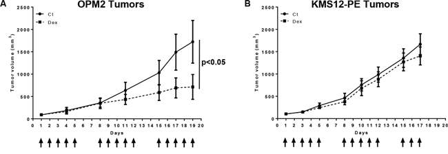 Figure 5: Dexamethasone reduces tumor cell growth of in vitro sensitive OPM2 but not resistant KMS12-PE cells in xenograft models. A. Dex treatment inhibited in vivo OPM2 tumor growth. Mice were subcutaneously injected with 12 × 106 OPM2 cells. The mice received either vehicle (Ct) or Dex (1 mg/kg, i.p.) 5 days per week for 3 consecutive weeks. Arrows indicate injections. The mice were then sacrificed on day 19. Statistical analysis was performed using a two-way ANOVA test, followed by a Bonferroni post-test. B. Dex treatment did not affect in vivo KMS12-PE tumor growth. Mice were subcutaneously injected with 12 × 106 KMS12-PE cells and treated as above. The mice were then sacrificed on day 17. Statistical analysis was performed using a two-way ANOVA test, followed by a Bonferroni post-test.