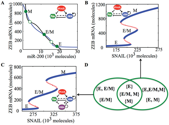 Figure 1: Dynamical system characteristics of the EMT decision-making circuit - (miR-200/ZEB). A. Nullclines of (miR-200/ZEB) circuit for SNAIL = 200 * 103 molecules representing three steady states: Epithelial (E—high miR-200, low ZEB), hybrid Epithelial/Mesenchymal (E/M—medium miR-200, medium ZEB) and Mesenchymal (low miR-200, high ZEB). Solid green dots represent stable states; hollow green dots represent unstable states. B. Bifurcation levels of mRNA levels of ZEB in response to SNAIL for miR-200/ZEB circuit. C. Bifurcation levels of mRNA levels of ZEB in response to SNAIL for miR-200/ZEB/OVOL circuit. Different phenotypes obtained at different levels of SNAIL are labeled alongside. D. Comparing the different phases (co-existence of different phenotypes) obtained for miR-200/ZEB in (B) and miR-200/ZEB/OVOL circuits in (C).