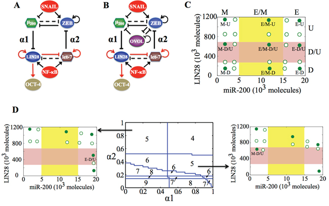 Figure 2: Coupling the decision-making circuits for EMT and stemness. A. Regulatory network showing coupling of miR-200/ZEB circuit with LIN28/let-7 circuit. B. Regulatory network showing coupling of miR-200/ZEB/LIN28/let-7 circuit with the transcription factor OVOL. A black solid arrow denotes transcriptional activation, and a black solid bar denotes transcriptional inhibition. Black dashed line indicates microRNA-mediated regulation, and red solid arrows imply non-transcriptional activation. α1 and α2 are coupling parameters between the EMT circuit (miR-200/ZEB) and the stemness circuit (LIN28/let-7) that vary from 0 to 1. The larger the value of α1, the stronger the inhibition of LIN28 by miR-200; and the larger the value of α2, the stronger the inhibition of ZEB by let-7. C. Phenotypic map representing all possible steady states of the coupled circuit (miR-200/ZEB/LIN28/let-7) for SNAIL = 200 * 103 molecules and NF-kB = 25 * 103 molecules, at α1 = α2 = 0.05 (very weak ‘feed-forward’ and ‘feed-backward’ coupling). Red shaded region defines the ‘stemness window’ based on relative LIN28 levels or equivalently relative OCT4 levels, and yellow shaded region represents range of miR-200 levels for the existence of the hybrid E/M phenotype, as noted in [23] for (miR-200/ZEB) circuit. D. (center) Phase diagram representing the number of stable steady states of the coupled circuit (miR-200/ZEB/LIN28/let-7) for varying values of (α1, α2) at SNAIL = 200 * 103, and NF-kB = 25 * 103 molecules. (left) Stable states of the coupled circuit at α1 = 0.3 and α2 = 0.9. (right) Stable states of the coupled circuit at α1 = 0.9 and α2 = 0.3. Green solid dots represent stable states, and green hollow dots are for unstable states. The labels ‘E-D/U’ (left) and ‘M-D/U’ (right) denote that epithelial and mesenchymal phenotypes respectively lie in stemness window.