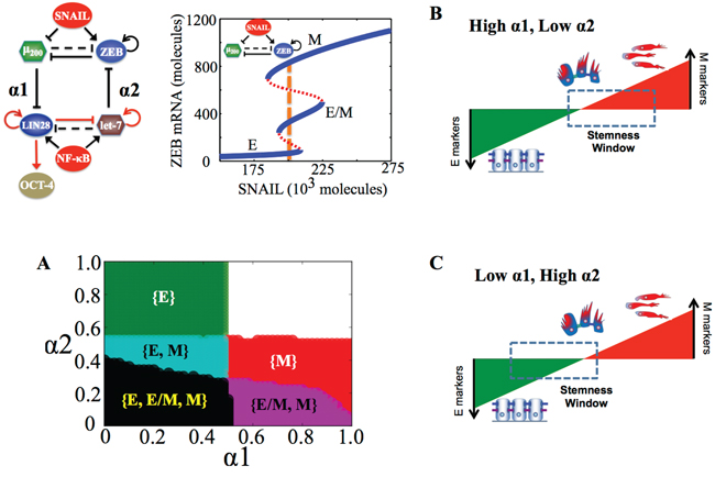 Figure 3: Stemness regions for different phenotypes under various (α1, α2), when cells are in {E, E/M, M} phase at α1 = α2 = 0. A. Phase diagram of the circuit representing the values of (α1, α2) for which the different phenotypes—E, M and E/M—can lie in stemness window respectively, for SNAIL = 200 * 103 molecules and NF-kB = 25 * 103 molecules. Areas with different colors represent different combinations of phenotypes than can gain stemness for that range of (α1, α2). B, C. Model for tunable ‘stemness window’ on the ‘EMT axis’, such that (high α1, low α2) allows for stemness to be associated with {E/M, M} and {M}, pushing the ‘stemness window’ towards the M end of the EMT axis, and (low α1, high α2) allows for stemness to be associated with {E}, pushing the ‘stemness window’ towards the E end of the EMT axis. The results presented here are for the circuit presented here, and SNAIL levels driving this circuit are marked by a dashed line in bifurcation diagram presented here.