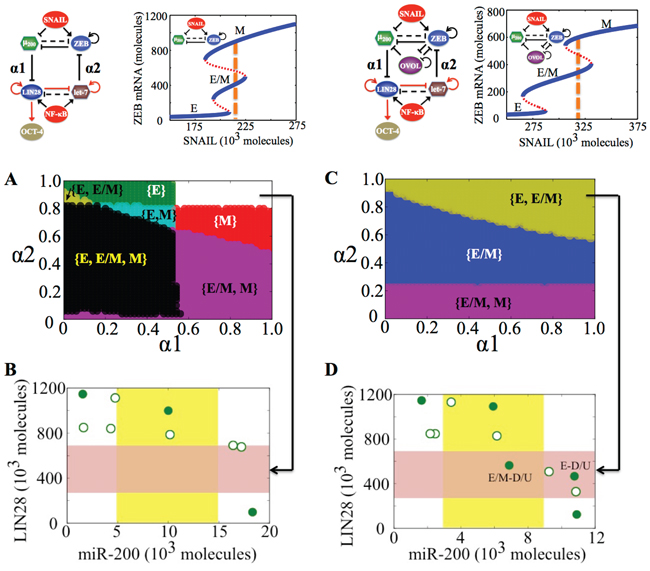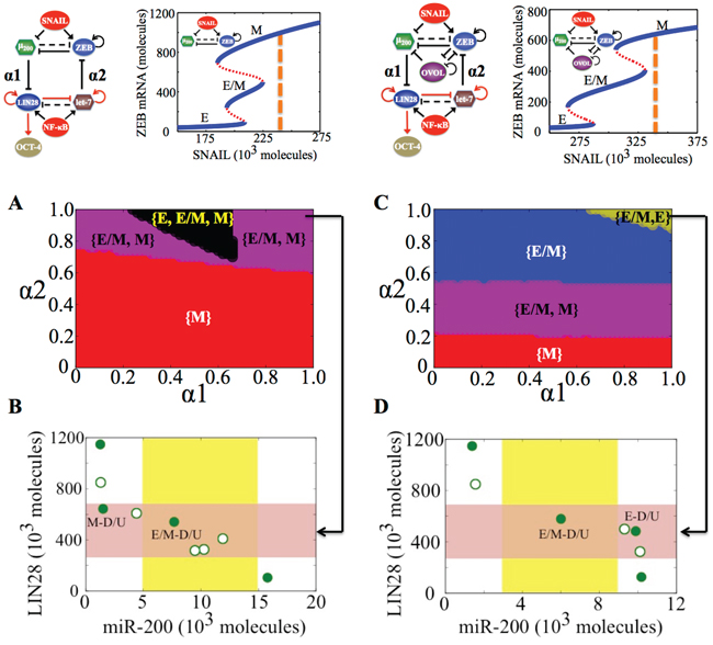 Figure 5: State-space characteristics of the coupled networks miR-200/ZEB/LIN28/let-7 and miR-200/ZEB/LIN28/let-7/OVOL, when cells are in {E/M, M} phase at α1 = α2 = 0. A. Phase diagram of the circuit miR-200/ZEB/LIN28/let-7 representing the values of (α1, α2) for which the different phenotypes can lie in stemness window, for SNAIL = 210 * 103 molecules and NF-kB = 25 * 103 molecules. B. Phenotypic map of the coupled circuit at α1 = α2 = 0.9 and at external signals SNAIL = 210 * 103 molecules and NF-kB = 25 * 103 molecules. Red shaded area shows the ‘stemness window’ based on relative OCT4 levels, and yellow shaded area represents the range of miR-200 levels for the existence of the hybrid E/M phenotype, as noted in [23] for (miR-200/ZEB) circuit and in [36] for (miR-200/ZEB/OVOL) circuit. C, D. represent a similar case for (A), (B) respectively but for the circuit with OVOL, therefore SNAIL = 320 * 103 molecules. Different colors represent different combinations of phenotypes that can gain stemness. Steady state diagram and phase diagram in every column are for the circuit drawn in the topmost row of that column, such that at α1 = α2 = 0 (no coupling between the EMT and stemness circuits), cells are in the phase marked by dashed lines in the bifurcation diagram drawn next to the circuit.