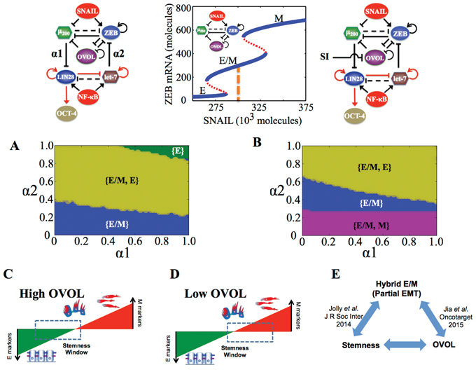 Figure 6: State-space characteristics of the miR-200/ZEB/let-7/OVOL circuit when the cells are in {E/M} phase at α1 = α2 = 0. A, B. Phase diagram of the circuit representing the values of (α1, α2) for which different phenotypes can attain stemness or lie in the ‘stemness window’, for SNAIL = 300 * 103 molecules and NF-kB = 25 * 103 molecules. (A) denotes the case without inhibition signal on OVOL (as shown in the circuit above (A)) and (B) is for the circuit with inhibition signal on OVOL (as shown in the circuit above (B)). Both (A, B) represent the case such that cells are in {E/M} phase at α1 = α2 = 0 (as shown by dashed line in the bifurcation figure). C–D. Flexible ‘stemness window’ model showing that (C) high levels of OVOL can pull the ‘stemness window’ towards the E end of the axis, and (D) low levels can let it slide towards the M end of the axis. E. Cartoon showing the interconnections between partial EMT or hybrid E/M phenotype, stemness and the effect of OVOL (Jolly et al). [18] suggest that hybrid E/M phenotype is enriched in stemness, Jia et al. [36] propose that endogenous OVOL levels can expand the range of existence of the hybrid E/M phenotype, and results here show that endogenous levels of OVOL can enable an association of stemness with the hybrid E/M phenotype.