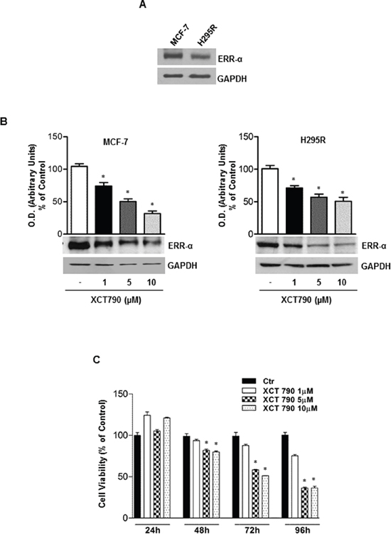 Figure 1: ERRα inverse agonist XCT790 decreases ERRα protein content and H295R cells growth in vitro. A. Western blot analysis of ERRα was performed on 50 μg of total proteins extracted from H295R and MCF-7 cells. Blots are representative of three independent experiments with similar results. (B. lower left and right panel), protein extracts from MCF-7 and H295R cells left untreated (–) or treated for 48 h with different doses of XCT790 were resolved by SDS-PAGE and subjected to immunoblot against ERRα. GAPDH served as loading control. (b, upper left and right panel), graphs represent means of ERRα optical density (O.D.) from three independent experiments with similar results normalized to GAPDH content (*p < 0.001 compared to untreated control sample assumed as 100). C. Cell viability after XCT790 treatment was measured using MTT assay. Cells were plated in triplicate in 24-well plates and were untreated (Ctr) or treated with increasing concentrations of XCT790 for the indicate times in DMEM supplemented with 2,5% Charcoal-Stripped FBS. Absorbance at 570 nm was measured on a multiwell-plate reader. Cell viability was expressed as a percentage of control, (*p < 0.001).