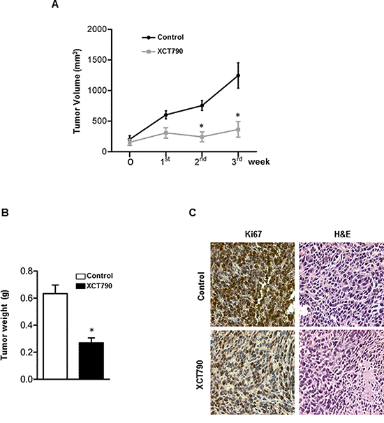 Figure 2: ERRα inverse agonist XCT790 decreases H295R cells proliferation in vivo. A. 6 × 106 H295R cells were injected subcutaneously onto the intrascapular region of immunocompromised mice and the resulting tumors were grown to an average of 200 mm3. The animals were randomized to vehicle controls or XCT790 treatment for twenty one days. Tumor volumes were calculated, as indicated in Materials and Methods. Values represent the mean ± SE of measured tumor volume over time in the control group (filled circles, n = 10) and in the XCT790-treated group (filled squares, n = 10). B. After 21 days (3 weeks) tumors were harvested and weighed. Values represent the mean ± SE of measured tumour weight (n = 10) *P < 0.05 versus control at the same day of treatment. C. Ki67 immunohistochemical and H & E staining: histologic images of H295R explanted from xenograft tumors (magnification X 400).