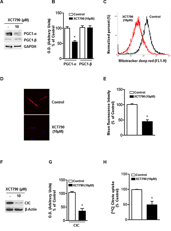 Figure 4: XCT-790 decreases mitochondrial mass and function in H295R cells. A. Total protein extracts from H295R cells, left untreated (–) or XCT790 treated in 2.5% DCC-FBS medium for 48 h were analyzed by Western blot with antibodies against PGC-1α and PGC-1β. GAPDH was used as loading control. B. Graphs represent means of PGC-1α and β optical densities (O.D.) from three independent experiments with similar results normalized to GAPDH content (*p < 0.001 compared to each untreated control sample assumed as 100). C. H295R cells were right untreated (control) or treated with XCT790. 48 h later, absorption of MitoTracker deep red FM was determined by FACS analysis. The uptake of MitoTracker was used as an indicator for the mitochondrial mass. D. Reduction in mitochondrial mass was further evaluated by fluorescence microscopy of MitoTracker-stained cells. E. Quantification of Mito-Tracker fluorescent signal intensity in untreated (control) or XCT790-treated H295R cells was evaluated measuring red fluorescent signal by a fluorescent plate reader (ex. 644; em. 665) *p < 0,001 compared to untreated control sample. F. Immunoblots for CIC expression from mitochondrial extracts in untreated (–) or XCT-790 treated H295R cells for 48 h. β-Actin served as loading control. Blots are representative of three independent experiments with similar results. G. Graph represent means of CIC density (O.D.) from three independent experiments with similar results normalized to β-Actin content (*p < 0.001 compared to untreated control sample assumed as 100). H. CIC activity was measured at 20 min as steady-state levels of citrate/citrate exchange. Transport was started by adding 0.5 mM [14C]Citrate to proteoliposomes preloaded internally with 10 mM citrate and reconstituted with mitochondria isolated from untreated H295R cells (Control; white column) and H295R-treated cells (black column). The transport reaction was stopped at 20 minutes. Results are expressed as percentage of the control. The data represent means ± SD of at least three independent experiments.