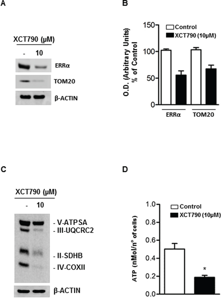 Figure 5: XCT790 decreased OXPHOS protein content and ATP concentration in H295R cells. A. Total protein extracts from H295R cells, left untreated (–) or treated for 48 h in 2.5% DCC-FBS medium with 10 μM XCT790, were analyzed by Western blot using antibodies against ERRα and TOM20. β-actin was used as loading control. B. Graphs represent means of ERRα and TOM20 optical densities (O.D.) from three independent experiments with similar results normalized to β-Actin content (*p < 0.001 compared to each untreated control sample assumed as 100). C. Total protein extracts from H295R cells left untreated (–) or treated for 48 h in 2.5% DCC-FBS medium with 10 μM XCT790, were analyzed by Western blot experiments using antibodies against OXPHOS subunits. β-Actin was used as loading control. Blots are representative of three independent experiments with similar results. D. ATP concentrations in H295R cells untreated (–) or treated with XCT790 were determined as described in Material and Methods and expressed as nmol/number of cells. Each column represents the mean ± SD of three independent experiments (*p < 0, 001).