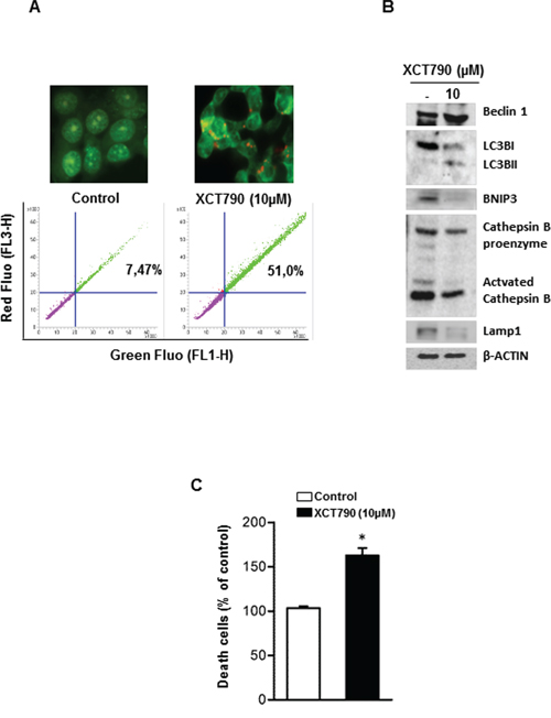 Figure 6: XCT790 induces necrosis in H295R cells. A. H295R cells were left untreated (control) or treated with XCT790 10 μM. After 48 h, cells were incubated with (1 μg/mL) acridine orange (AO) solution for 30 min at 37°C. Absorption of AO was determined by FACS analysis (lower panel). In the same experimental conditions, treated or untreated H295R cells were stained with acridine orange, mounted and immediately analyzed by fluorescent microscope (upper panel). B. Total protein extracts from H295R cells left untreated (–) or treated in 2.5% DCC-FBS medium with XCT790, as indicated, for 48 h were analyzed by Western blot experiments using antibodies against Beclin 1, LC3B, BNIP3, Cathepsin B, Lamp1. β-Actin was used as loading control. Blots are representative of three independent experiments with similar results. C. Cell death by necrosis was assessed by Trypan blue-exclusion assay in H295R cells untreated (–) or treated with XCT790. The mean ± SD of three replicates are shown. Cell death was expressed as a percentage of control, (*p < 0.001).