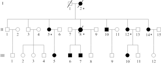 Figure 1: Pedigree structure of the Chinese family with familial adenomatous polyposis. Family members with FAP are indicated with Shading. Squares and circles denoted males and females respectively. Individuals labeled with a solidus were deceased. Asterisks refer to colorectal cancer.Roman numerals indicate generations.