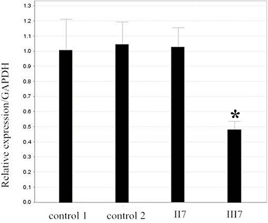 Figure 2: Verification of the deletion in II7 and III7 by real-time PCR. Relative amplification (RA) level of the exon 15 in patient II7 and control is nearly 1, and the RA level in III7 is approximately half. GAPDH DNA was used as a loading control.