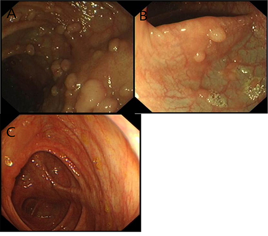 Figure 4: The characterization of the index patients in the pedigree. Some sessile polyps were present in the transverse colon. A. Tubular adenomas of Patient II8 with focal adenocarcinoma in situ. B. Six sessile polyps in the rectum of Patient III6. C. No polyps in the unaffected member.