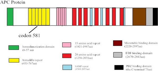 Figure 5: Sequence alignment shows the c.1936–2148 del in exon 14–15 of the APC gene, which creates a STOP codon at 581. Diagram of the protein structure of APC.