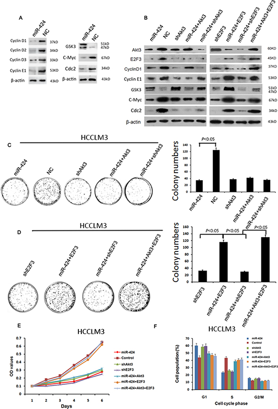 Figure 6: miR-424 represses the expression of cell cycle/E2F signaling. A. overexpression of miR-424 inhibit the protein expression level of several members of Akt3/ E2F3 signaling. B. Western blot results showed the regulation relationships between miR-424 and its downstream proteins C–F. Colony formation assay (C&D), cell proliferation assay (E) and cell cycle analysis (F) showed that the inhibitory effect of miR-424 on HCC cell proliferation was abrogated by overexpression of mixture E2F3 and Akt3 or E2F3 alone, while this phenotype did not produced in miR-424 transduced cells only Akt3 overexpressed alone.
