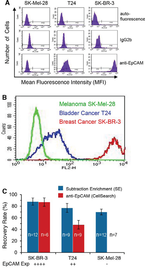 Figure 1: Characterization of EpCAM expression on tumor cells and comparison of isolation efficiency between subtraction enrichment (SE) vs anti-EpCAM capture strategy. A. Compared to cell autofluorescence (auto) and the negative control of isotype IgG2b, PE-anti-EpCAM does not bind to the melanoma cell line SK-Mel-28, but does bind to the bladder cancer T24 and the breast cancer SK-BR-3 cell lines. B. Overlay of binding histograms demonstrates very strong binding of anti-EpCAM to breast (red) and medium strength binding to bladder cancer cells (blue), but no binding to melanoma cells (green). C. Results of recovery rate of the 2 different methodologies are demonstrated in 2 different colors. Eighty eight and 87% of the spiked SK-BR-3 breast cancer cells with high EpCAM expression (++++) are recovered by both SE (blue) and anti-EpCAM capture (red) strategy, respectively. Seventy seven percent of T24 bladder cancer cells with intermediate EpCAM expression (++) are enriched by SE, whereas 48% of those cells are isolated by anti-EpCAM. None of the SK-Mel-28 melanoma cells that do not express EpCAM (-) is isolated by anti-EpCAM technique. However, 70% of melanoma cells are recovered by the non-EpCAM-dependent SE. Results (mean ± SD) represent the average of values obtained in the number of separate experiments indicated by n.