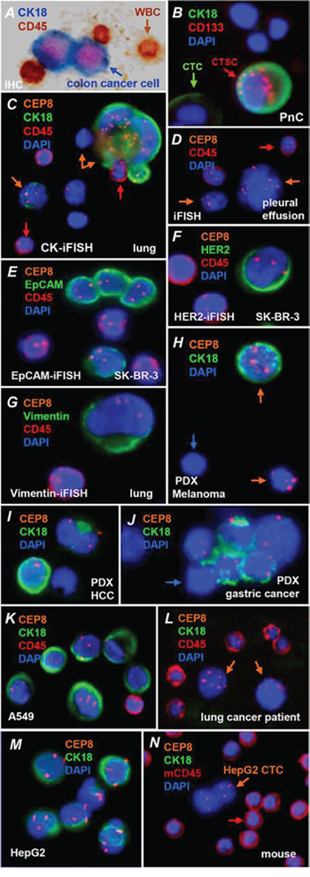 Figure 2: In situ phenotyping and karyotyping CTCs and DTCs enriched from cancer patients or mice bearing human tumors. A. Colon cancer cells (SW480) enriched from blood by SE are identified by immunohistochemistry staining and visualized under a bright field microscope. CK18 and nuclei of tumor cells are stained in blue and pink, respectively. WBCs show color of brown. B. A circulating tumor stem cell (CTSC) (CK18+, CD133+, red arrow) and CTC (CK18+, CD133-, green arrow) enriched from the blood of a pancreatic cancer patient are identified by immunofluorescent staining. C. Non-hematopoietic heteroploid lung cancer CTCs (orange arrows) enriched from a NSCLC lung cancer patient's blood sample are identified by CK18-iFISH, and respectively show strong, medium and undetectable CK18 expression. A large multiploid CTC with strong positive CK18, and a small triploid CTC with medium positive CK18 as well as a small monoploid CTC with undetectable CK18 expression are observed. WBCs are indicated by red arrows. D. Disseminated tumor cells enriched from the malignant pleural effusion of a patient with pancreatic cancer metastasizing to lung are identified by iFISH and characterized as non-hematopoietic heteroploid cells (CD45-, iFISH+, orange arrows). One of the tumor cells is similar in size to that of a WBC (red arrow). E. EpCAM-iFISH shows that enriched aneuploid breast cancer cells SK-BR-3 EpCAM+, iFISH+, and CD45-. F. An enriched triploid non-hematopoietic breast cancer cell (SK-BR-3) with distinct expression of HER2 is demonstrated by HER2-iFISH. G. Expression of Vimentin in an enriched non-hematopoietic NSCLC patient CTC is revealed by Vimentin-iFISH. H. Human melanoma CTCs (orange arrows) enriched from a metastatic mPDX mouse blood sample are identified by CK18-iFISH; they have either detectable (iFISH+, CK18+), or undetectable CK18 (iFISH+, CK18-) which is similar in size to a mouse WBC (blue arrow). Human CEP8 FISH probe doesn't hybridize to mouse WBC's chromosomes. I. Human HCC CTCs in a mPDX mouse show detectable CK18 with either homogeneous or polar distribution in cells (iFISH+, CK18+). J. Human gastric carcinoma CTCs enriched from the Cisplatin treated mPDX mouse model have both very strong and extremely weak CK18 expressing tumor cells in the enriched circulating tumor microemboli (CTM), and majority of those cells show a similar size to that of murine WBC (blue arrow). K. All aneuploid A549 lung cancer cells enriched from blood are CK18+ (green) (iFISH+, CK18+). L. Neither of 2 lung cancer patient CTCs shows detectable CK18 (iFISH+, CK18-, orange arrows). M. All human HepG2 HCC cells are aneuploid and CK18+ (iFISH+, CK18+). N. An identified CTM consisting of 2 heteroploid HepG2 CTCs in a mouse tumor model established with the same HepG2 cell line cells does not have detectable CK18 (iFISH+, CK18-, mouse CD45-, orange arrow). Murine WBCs identified by anti-mouse CD45 (mCD45) are indicated by a red arrow.