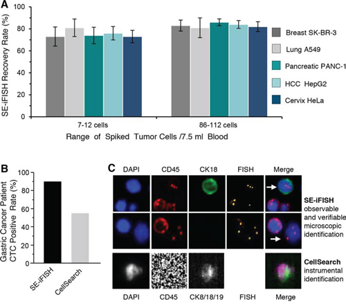 Figure 3: Validation of SE-iFISH. A. For the group of low number of 7–12 spiked cells, recovery rate is 73% (breast), 81% (lung), 74% (pancreatic), 76% (HCC) and 73% (cervix), respectively. When high number of 86–112 of different tumor cells are spiked, 83% (breast), 81% (lung), 86% (pancreatic), 84% (HCC) and 82% (cervix) cancer cells are recovered by SE-iFISH. Results (mean ± SD) represent the average of values obtained in 3 separate experiments. B. Clinical validation of SE-iFISH on the advanced gastric cancer patients. Microscopically observed and verified SE-iFISH results show that 90.5% of patients have detectable non-hematopoietic aneuploid CTCs in 7.5 ml of blood, whereas CellSearch instrument detection demonstrates a positive rate of 54.8% for the same population of patients. C. Gastric cancer cells identified by iFISH (white arrow) are CK18+/triploid or CK18-/triploid. WBC shows a red ring of CD45 positive staining. Fluorescent image of cancer cells identified by iFISH is microscopically observable for verification. Gastric cancer CTC image acquired by CellSearch without available FISH identification is demonstrated.