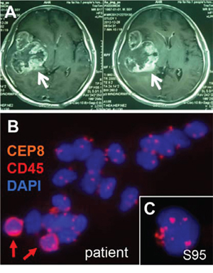 Figure 5: Detection of heteroploid glioma tumor cells disseminated in cerebrospinal fluid of a malignant glioma patient. A. MRI scans of the glioma patient. The right temporal glioblastoma with obvious enhancement and necrosis is indicated by arrow. B. A cluster of malignant heteroploid glioma tumor cells (CTM) enriched from cerebrospinal fluid of the same patient is shown. WBCs are indicated by red arrows. C. Image of the cultured primary glioblastoma cells S95 shows heteroploid chromosome 8.
