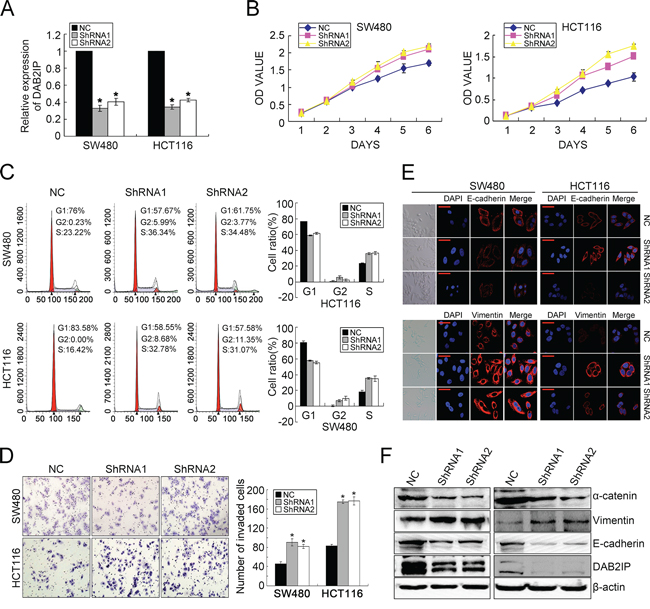 Figure 1: DAB2IP KD promotes proliferation, invasion and EMT in CRC cells. A. DAB2IP expression in SW480 and HCT116 cell lines transfected with two specific shRNAs toward DAB2IP by real-time PCR. B. Effect of DAB2IP KD on the proliferation of SW480 and HCT116 cells by MTT assay. C. Effect of DAB2IP KD on cell cycle of SW480 and HCT116 cells by Flow Cytometry. D. Effect of DAB2IP KD on the invasion of SW480 and HCT116 cells by Boyden chamber. Scale bars represent 50 μm. E. Immunofluorescence analyses of E-cadherin and Vimentin in DAB2IP KD cells. Representative morphologic transition was also shown. Scale bars represent 10 μm. F. The expressions of E-cadherin, α-catenin and Vimentin in DAB2IP KD SW480 and HCT116 cells by Western blotting.