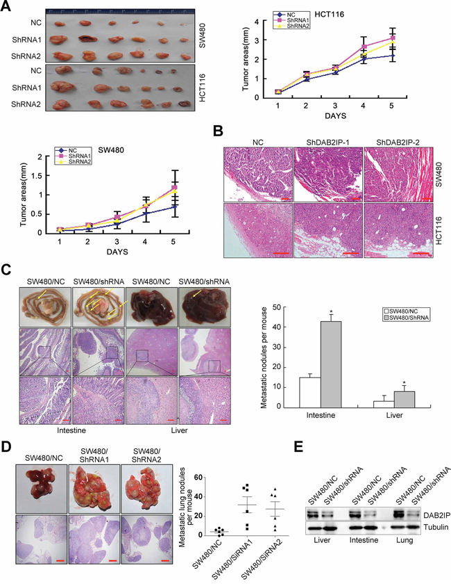 Figure 2: DAB2IP is sufficient to inhibit tumor growth and metastasis of CRC cells. A. Effect of DAB2IP KD on subcutaneous tumor growth by MTT assay. B. Local invasion of subcutaneous tumors in DAB2IP KD group and control group. Small scale bars represent 100 μm. C. Images of intestinal and hepatic metastases of mice injected with DAB2IP KD SW480 cells (n = 5), and number of metastatic intestinal or hepatic nodules per mice. Small scale bars represent 200 μm. D. Image of pulmonary metastases of mice injected with DAB2IP KD SW480 cells, and number of metastatic lung nodules per mice. Scale bars represent 500 μm. E. Expression of DAB2IP in liver, intestinal or lung metastatic tumors in mice injected with DAB2IP KD cells and control cells by Western blotting. *P < 0.05.