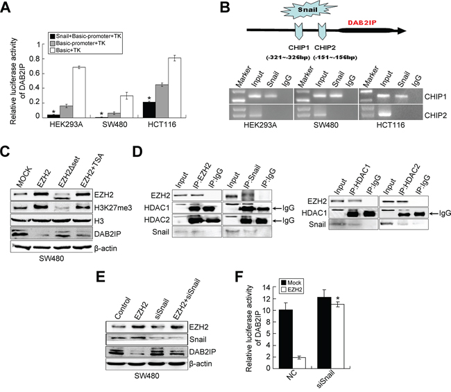 Figure 3: Snail negatively regulates DAB2IP expression. A. Luciferase activity of DAB2IP promoter after transfection of Snail plasmid in HEK293A, SW480 and HCT116 cells. B. ChIP assay in HEK293A, SW480 and HCT116 cells transfected with a vector expressing Snail. PCR was performed with primers specific for two binding sites (CHIP1 and CHIP2) within DAB2IP promoter. C. Effects of ectopic EZH2, EHZ2ΔSET and EZH2 with TSA treatment on the expressions of DAB2IP, H3 and H3K27me3 in SW480 cells by Western blotting. D. The physical interactions between HDAC1/2 and EZH2, HDAC1/2 and Snail in SW480 cells examined by co-IP. E. Expressions of EZH2, Snail and DAB2IP in EZH2-overexpressing, Snail-KD or EZH2-overexpressing/Snail-KD cells by Western blotting. F. Effect of Snail KD on luciferase activity of DAB2IP after transfection of EZH2 plasmid in SW480 cells.