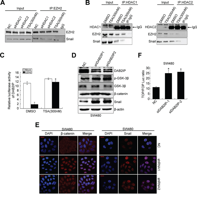 Figure 4: DAB2IP is negatively regulated by EZH2/HDAC/snail linear transcription complex. A. Effects of HDAC1/2 knockdown, TSA treatment on the physical interactions between EZH2 and Snail by co-IP. B. Effects of TSA treatment on the physical interactions between HDAC1/2 and EZH2, HDAC1/2 and Snail by co-IP. C. Effect of TSA on the luciferase activity of DAB2IP promoter after transfection of EZH2 plasmid in SW480 cells. D. Expressions of DAB2IP, p-GSK-3β, GSK-3β, β-catenin and Snail in DAB2IP KD SW480 cells. E. Confocal microscopy visualization of subcellular localization of β-catenin and Snail in DAB2IP KD SW480 cell. Scale bars represent 10 μm. F. TOP/FOP luciferase activity after transfection of DAB2IP siRNAs in SW480 cells.