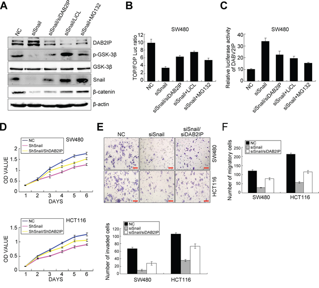 Figure 5: The positive feedback loop between Snail and DAB2IP exists in CRC cells. A. Expressions of DAB2IP, p-GSK-3β, GSK-3β, Snail and β-catenin in Snail KD SW480 cells and Snail/DAB2IP KD SW480 cells with LiCL, MG132 treatments by Western blotting. B. TOP/FOP luciferase activity in Snail KD SW480 cells and Snail/DAB2IP KD SW480 cells with LiCL, MG132 treatments. C. Luciferase activity of DAB2IP promoter in Snail KD SW480 cells and Snail/DAB2IP KD SW480 cells with LiCL, MG132 treatments. D. Effects of Snail and Snail/DAB2IP KD on the proliferation of SW480 and HCT116 cells by MTT assay. E. Effect of Snail and Snail/DAB2IP KD on the invasiveness of SW480 and HCT116 cells by Boyden chamber. Scale bars represent 50 μm. F. Effect of Snail and Snail/DAB2IP KD on the migration of SW480 and HCT116 cells by Transwell chamber.