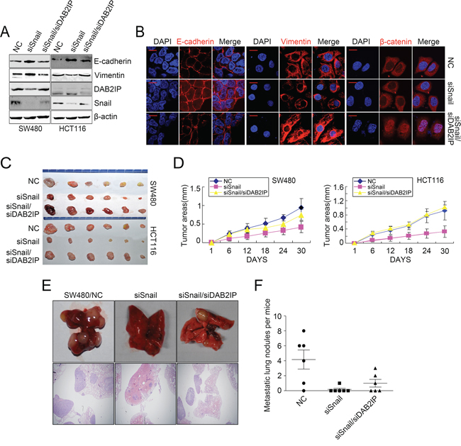 To validate that snail mediated CRC progression was through DAB2IP, we examined the effect of blocking DAB2IP on Snail KD-induced proliferation, invasion, EMT and metastasis. As expected, Snail KD attenuated cell proliferation in vitro in SW480 and HCT116 cells, as shown by MTT and colony formation assays, while these effects were obviously abolished upon depletion of DAB2IP (Figure 5D, Supplementary Figure S4B). Snail KD also reduced the number of migratory and invaded CRC cells in vitro. However, reintroduction of DAB2IP KD alleviated the suppressive effects of Snail KD on SW480 and HCT116 cells (Figure 5E–5F). Snail KD suppressed EMT in SW480 and HCT116 cells, as shown by up-regulation of E-Cadherin and down-regulation of Vimentin (Figure 6A, 6B). It also reduced the nuclear translocation of β-catenin (Figure 6B). However, ectopic expression of DAB2IP KD rescued the Snail-deficient MET phenotypes (Figure 6A, 6B). In the mouse models of tumor growth and metastasis, Snail KD cells and Snail/DAB2IP KD cells were injected in subcutaneous site of nude mice or into tail vein to seed lung metastases, respectively. Snail KD SW480 and HCT116 cells inhibited the growth of subcutaneous tumors (Figure 6C–6D). Moreover, Snail KD SW480 cells strikingly suppressed their capacity to seed lung metastases (Figure 6E, 6F). However, reintroduction of DAB2IP KD reversed Snail KD-induced growth and metastasis (Figure 6C–6F). Based on these results it would be reasonable to conclude that Snail’s function on the proliferation, invasion, EMT and metastasis in CRC cells requires the presence of DAB2IP.