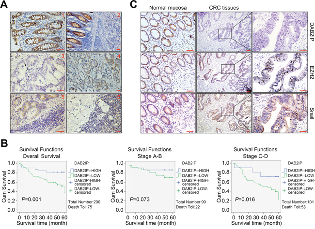 Figure 7: Down-regulation of DAB2IP correlates with Snail and EZH2 in CRC tissues. A1. Strong positive staining of DAB2IP in the cytoplasm of adjacent normal mucosa. Scale bars represent 20 μm. A2. Down-regulation of DAB2IP in sections containing both normal and cancerous tissue. Scale bars represent 50 μm. A3. Negative staining of DAB2IP in the cytoplasm of CRC cells. Scale bars represent 20 μm. A4. Weak expression of DAB2IP in the cytoplasm of CRC cells. Scale bars represent 50 μm. A5. Weak expression of DAB2IP in lymphatic metastatic tissues of CRC. Scale bars represent 20 μm. A6. Negative expression of DAB2IP in lymphatic metastatic tissues of CRC. Scale bars represent 50 μm. B. Kaplan-Meier analysis of overall survival in total and subgroups of CRC patients. C. Expressions of DAB2IP, EZH2 and Snail proteins in normal mucosa and CRC tissues from the same specimens. Small scale bars represent 200 μm.
