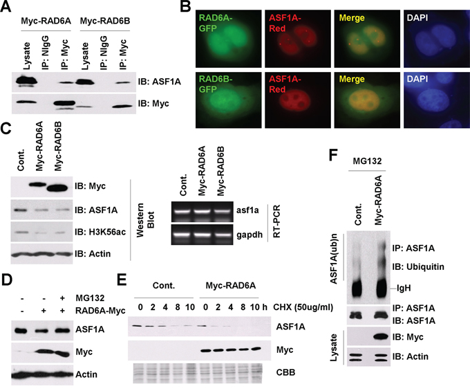 Figure 1: RAD6 regulates ASF1A ubiquitination and degradation in Homo sapiens. A. RAD6 interacts with ASF1A in vivo. HL-7702 cells were transfected with Myc-tagged RAD6A and RAD6B for 48 h. Cell extracts were then prepared and subjected to a co-immunoprecipitation assay with antibodies against anti-Myc or anti-NIgG (normal IgG antibody, as a negative control). Western blot assays were performed with an anti-ASF1A antibody to detect the interaction between RAD6 and ASF1A. B. RAD6 colocalizes with ASF1A in HL-7702 cells. HL-7702 cells transfected with RAD6A-GFP or RAD6B-GFP together with ASF1A-Red were stained with DAPI. C. RAD6 regulates ASF1A protein levels and H3K56Ac levels. HL-7702 cells were transfected with or without Myc-tagged RAD6A or RAD6B for 48 h. The cells were lysed for western blot assays with antibodies as indicated (upper). HL-7702 cells were transfected with or without Myc-tagged RAD6A or RAD6B for 48 h. Total RNA was isolated and subjected to an RT-PCR assay with primers specific for asf1a and gapdh genes (lower). D. The regulation of ASF1A protein levels by RAD6 is mainly through the 26s proteasome pathway. HL-7702 cells transfected with or without Myc-tagged RAD6A for 48 h were treated with or without 25 μM MG132 for another 10 h. Cell extracts were then prepared and subjected to western blot assays with antibodies as indicated. E. RAD6 promotes ASF1A degradation. HL-7702 cells were transfected with or without Myc-tagged RAD6 for 48 h. The cells were then incubated with 50 μg/mL CHX for the indicated times. Cell lysates were prepared and subjected to western blot assays with antibodies as indicated. F. RAD6 promotes ASF1A ubiquitination. HL-7702 cells were transfected with or without Myc-tagged RAD6A for 48 h. The cells were then incubated with 25 μM MG132 for another 10 h. An immunoprecipitation experiment was performed using an anti-ASF1A antibody under denaturing conditions. An anti-ubiquitin antibody was used in a western blot assay to detect the ubiquitinated form of ASF1A.