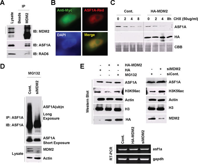 Figure 2: MDM2 regulates ASF1A ubiquitination and degradation in Homo sapiens. A. MDM2 interacts with ASF1A and RAD6 in vivo. HL-7702 cells were lysed for an endogenous Co-IP assay with an anti-MDM2 antibody. Western blot assays were performed using anti-ASF1A or anti-RAD6 antibodies to detect the interaction between MDM2 and ASF1A or MDM2 and RAD6 in vivo. B. MDM2 colocalizes with ASF1A in HL-7702 cells. HL-7702 cells transfected with MDM2-Myc and ASF1A-Red were used for an immunofluorescence assay with an anti-myc antibody (green). C. MDM2 promotes ASF1A degradation. HL-7702 cells were transfected with or without HA-tagged MDM2 for 48 h. The cells were then incubated with 50 μg/mL CHX for the indicated times. Cell lysates were prepared and subjected to western blot assays with antibodies as indicated. D. MDM2 regulates ASF1A ubiquitination. HL-7702 cells were transfected with control or MDM2-specific siRNA for 48 h as indicated. The cells were then incubated with 25 μM MG132 for another 10 h. An immunoprecipitation experiment was performed using an anti-ASF1A antibody under denaturing conditions. An anti-ASF1A antibody was used in a western blot assay to detect the ubiquitinated form of ASF1A. E. MDM2 regulates ASF1A protein levels and H3K56Ac levels through the 26s proteasome. HL-7702 cells were transfected with an HA-tagged MDM2 plasmid or a control HA empty vector or with MDM2-specific siRNA or control siRNA for 48 h. The cells were then lysed for western blot assays with antibodies as indicated (upper). HL-7702 cells were transfected with HA-tagged MDM2 or MDM2-specific siRNA for 48 h. Total RNA was isolated and subjected to an RT-PCR assay with primers specific for asf1a and gapdh genes (lower).